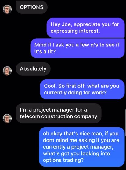 • Good: 1. Greet the lead and ask about their current situation: "hey {lead's first name}. i usually ask a couple quick q's to get you the best info. if that's cool, bring me up to speed on your biz"